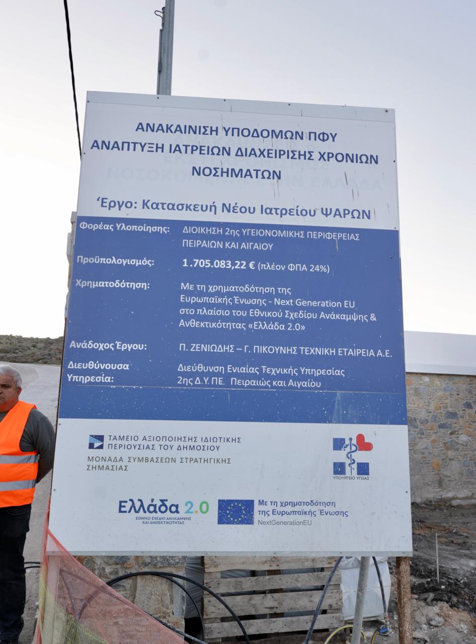 Το σημαντικότερο, ωστόσο, έργο που βρίσκεται σε εξέλιξη είναι η κατασκευή του νέου Πολυδύναμου Περιφερειακού Ιατρείου, προϋπολογισμού 2,2 εκατ. ευρώ, που χρηματοδοτείται μέσω του Ταμείου Ανάκαμψης και Ανθεκτικότητας και υλοποιείται σε συνεργασία με τον Δήμο Ηρωικής Νήσου Ψαρών. Το νέο κτίριο θα περιλαμβάνει σύγχρονους χώρους για ιατρεία και πέντε πλήρως εξοπλισμένα διαμερίσματα για τη φιλοξενία του προσωπικού, αναβαθμίζοντας τις παρεχόμενες υπηρεσίες πρωτοβάθμιας φροντίδας.