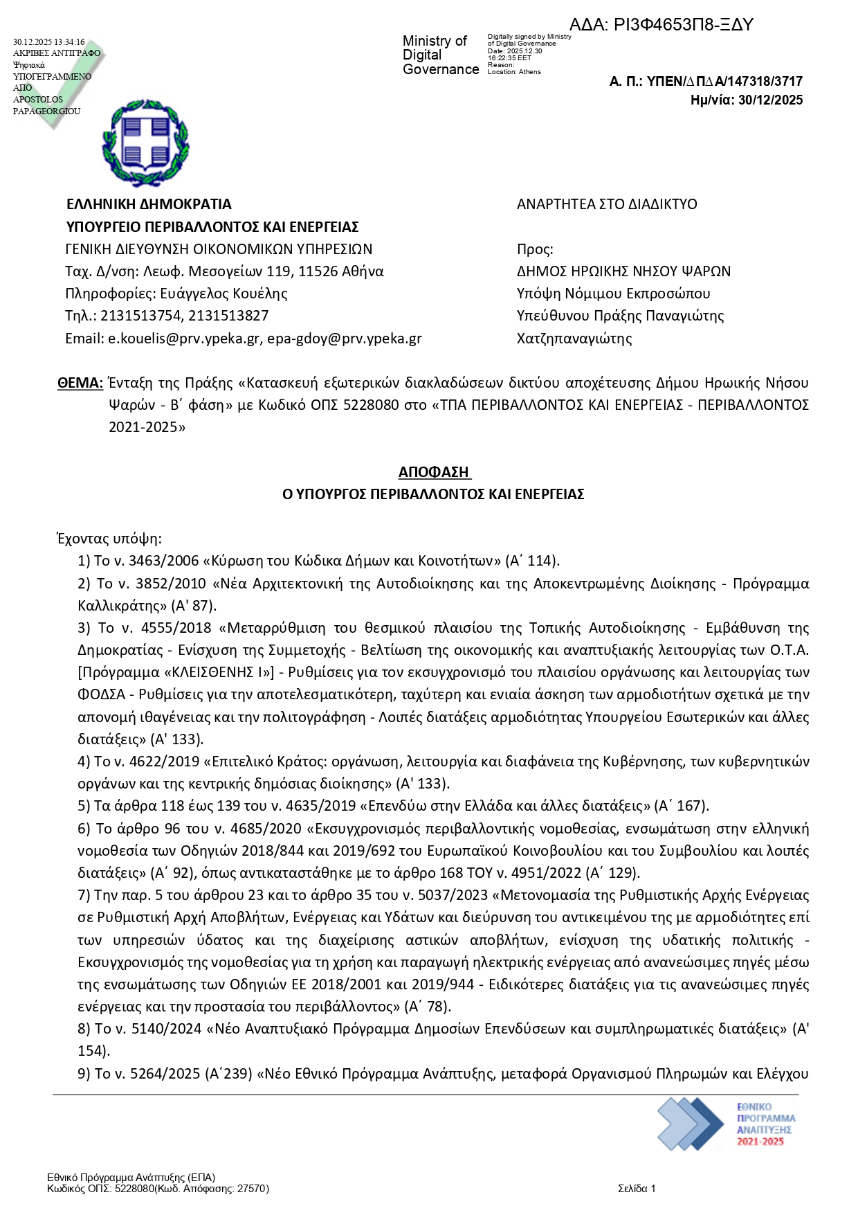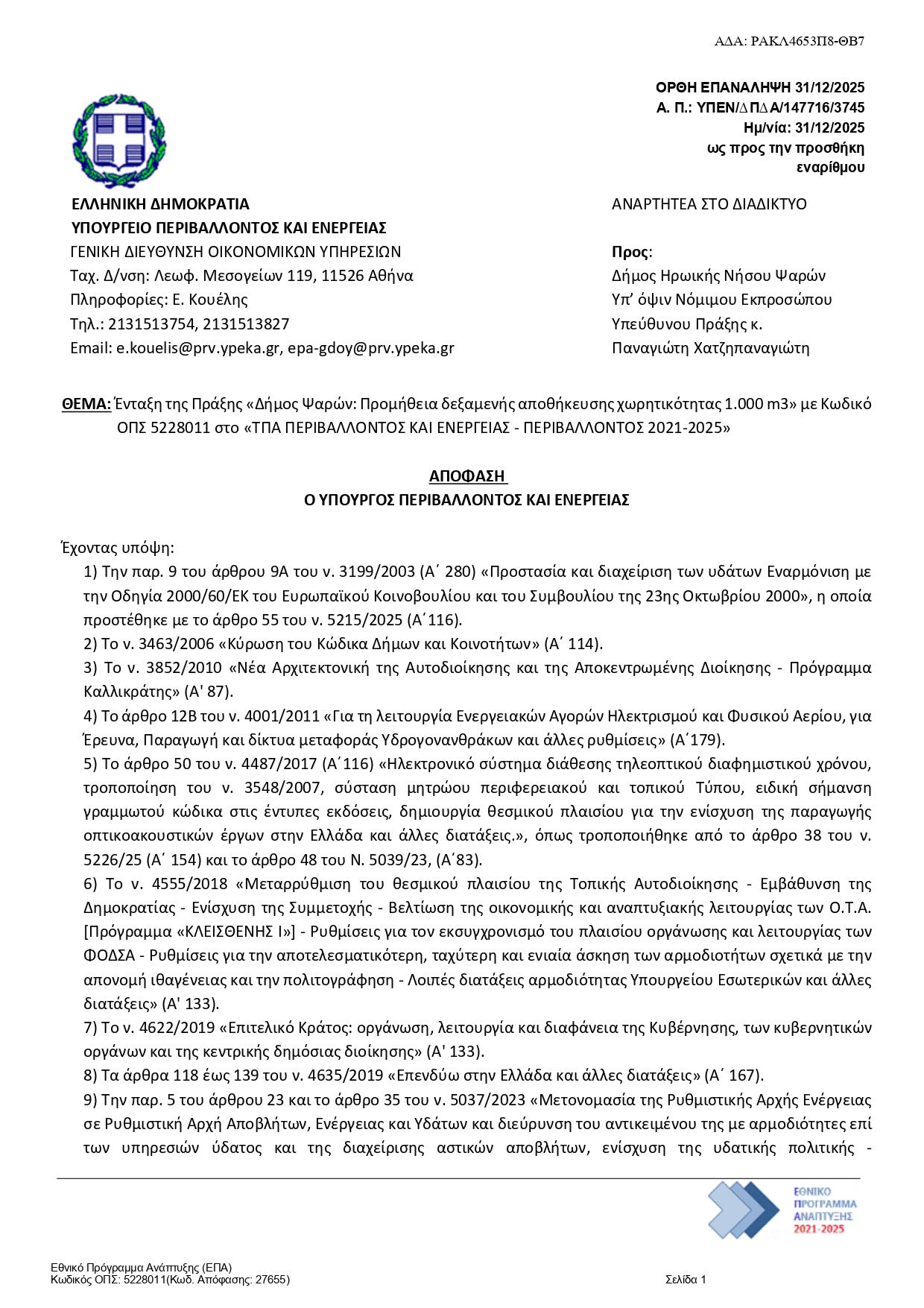 Ο Δήμαρχος ευχαρίστησε θερμά τον Υπουργό Περιβάλλοντος και Ενέργειας κ. Σταύρο Παπασταύρου, τον Γενικό Γραμματέα Συντονισμού Διαχείρισης Αποβλήτων κ. Μανώλη Γραφάκο, καθώς και τα υπηρεσιακά στελέχη του Υπουργείου για τη στήριξη και την έγκριση των έργων. Παράλληλα, εξέφρασε τις ευχαριστίες του προς τα στελέχη του Δήμου Ηρωικής Νήσου Ψαρών για τη συστηματική εργασία τους στην ωρίμανση και τεκμηρίωση των προτάσεων.