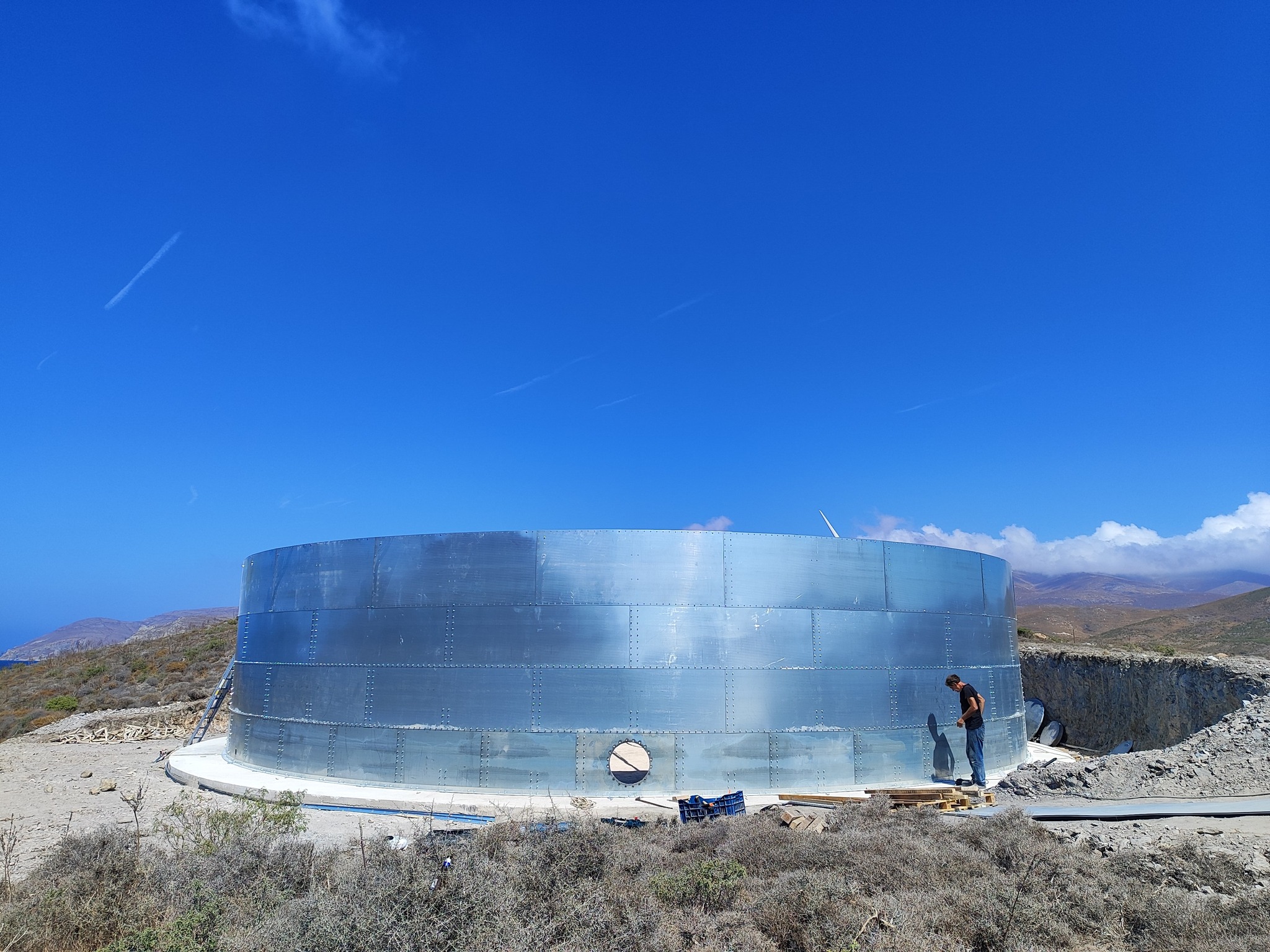 Πρόκειται για την προμήθεια και εγκατάσταση προκατασκευασμένης μεταλλικής δεξαμενής πόσιμου νερού, η οποία θα τοποθετηθεί στο δημοτικό οικόπεδο των δεξαμενών και θα λειτουργεί σε συνδυασμό με τις υφιστάμενες υποδομές, ενισχύοντας σημαντικά τον διαθέσιμο αποθηκευτικό χώρο, την ασφάλεια και την επάρκεια ύδρευσης του νησιού μας, ιδιαίτερα κατά τους καλοκαιρινούς μήνες.