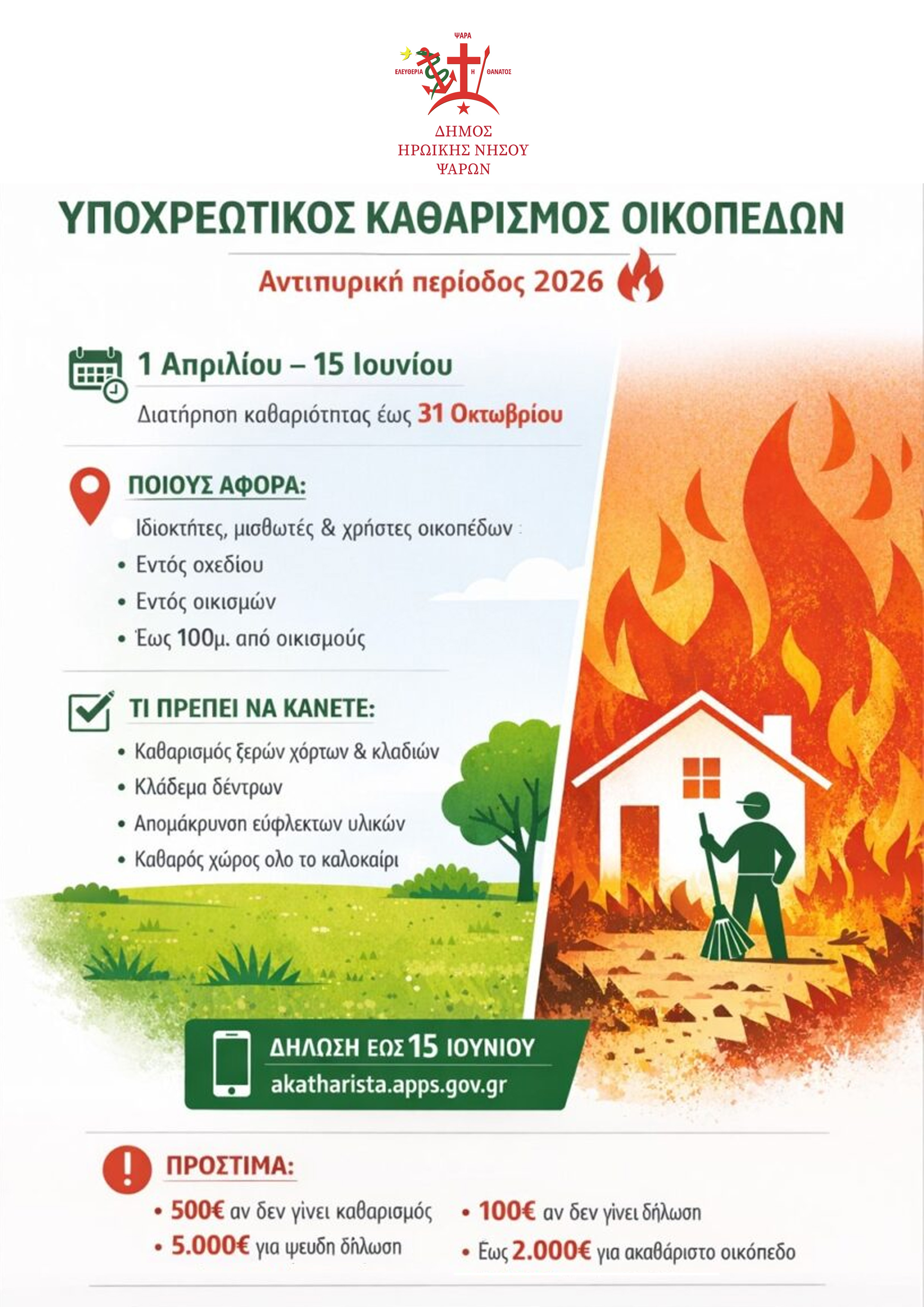 Σύμφωνα με το Ν. 5281/2026, οι ιδιοκτήτες οικοπεδικών και λοιπών ακάλυπτων χώρων, οφείλουν να προβούν σε υποχρεωτικό καθαρισμό των οικοπέδων τους από την 1η Απριλίου έως τη 15η Ιουνίου του τρέχοντος έτους και στην συντήρησή τους έως 31 Οκτωβρίου που λήγει η αντιπυρική περίοδος.