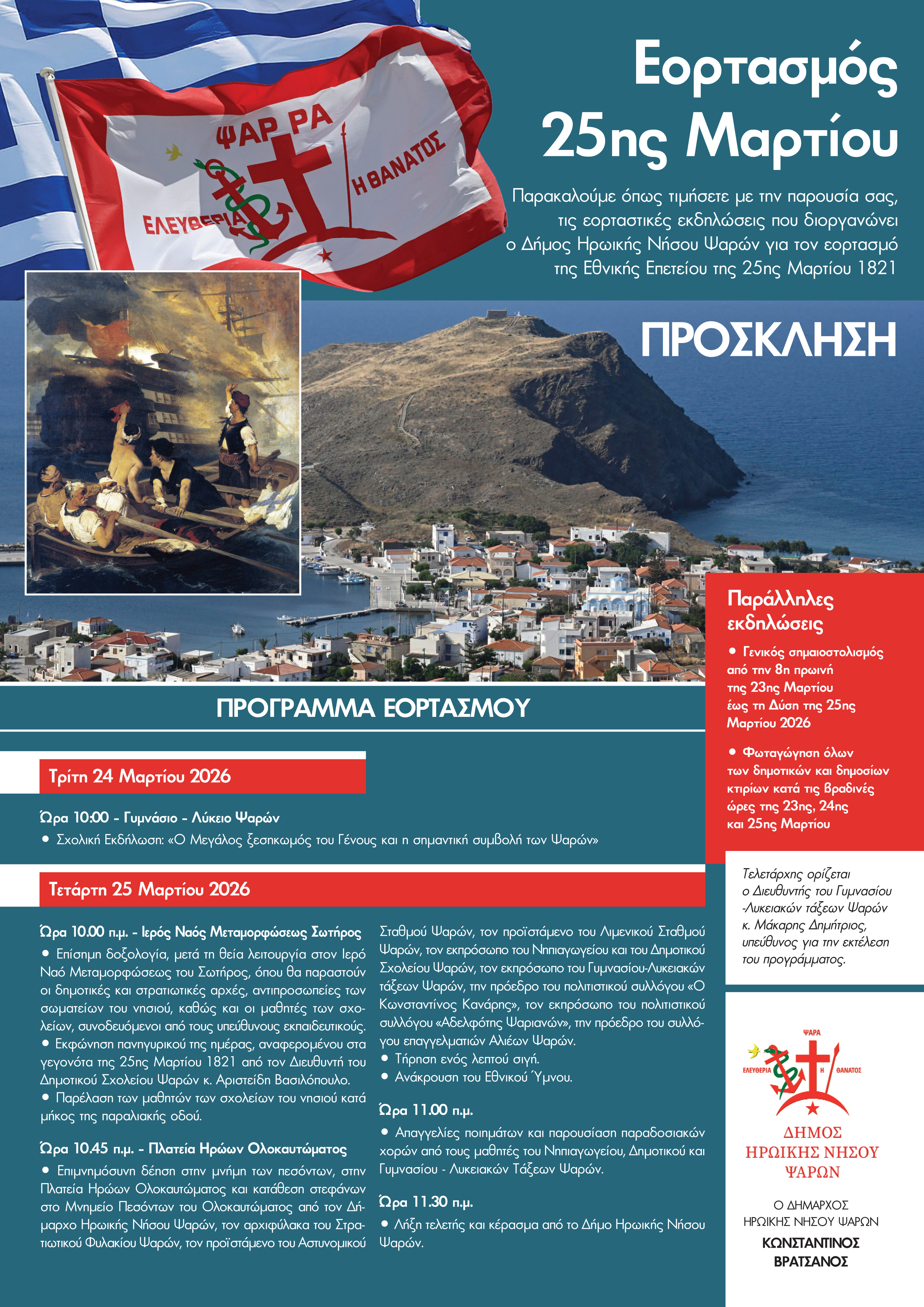 Παρακαλούμε όπως τιμήσετε με την παρουσία σας, τις εορταστικές εκδηλώσεις που διοργανώνει ο Δήμος Ηρωικής Νήσου Ψαρών για τον εορτασμό της Εθνικής Επετείου της 25ης Μαρτίου 1821.