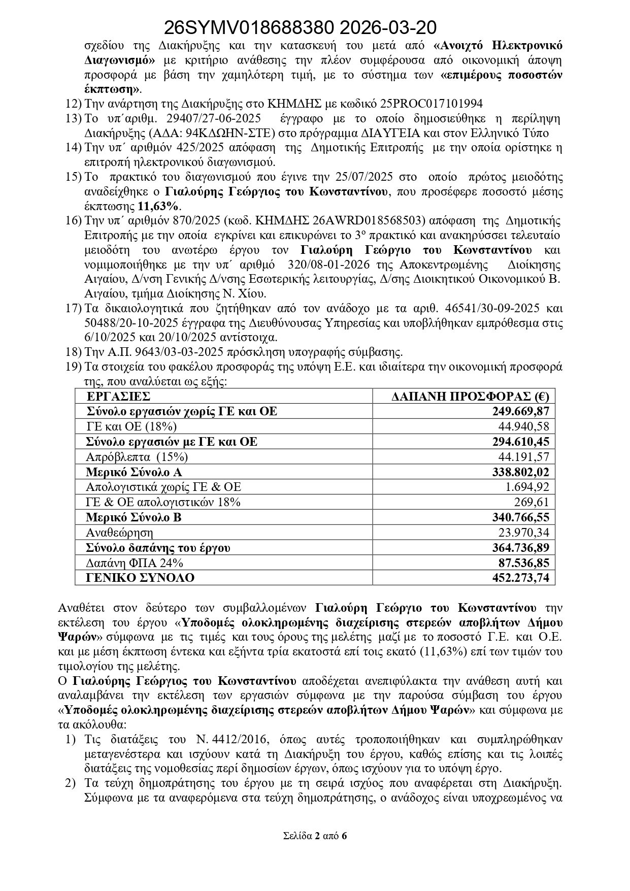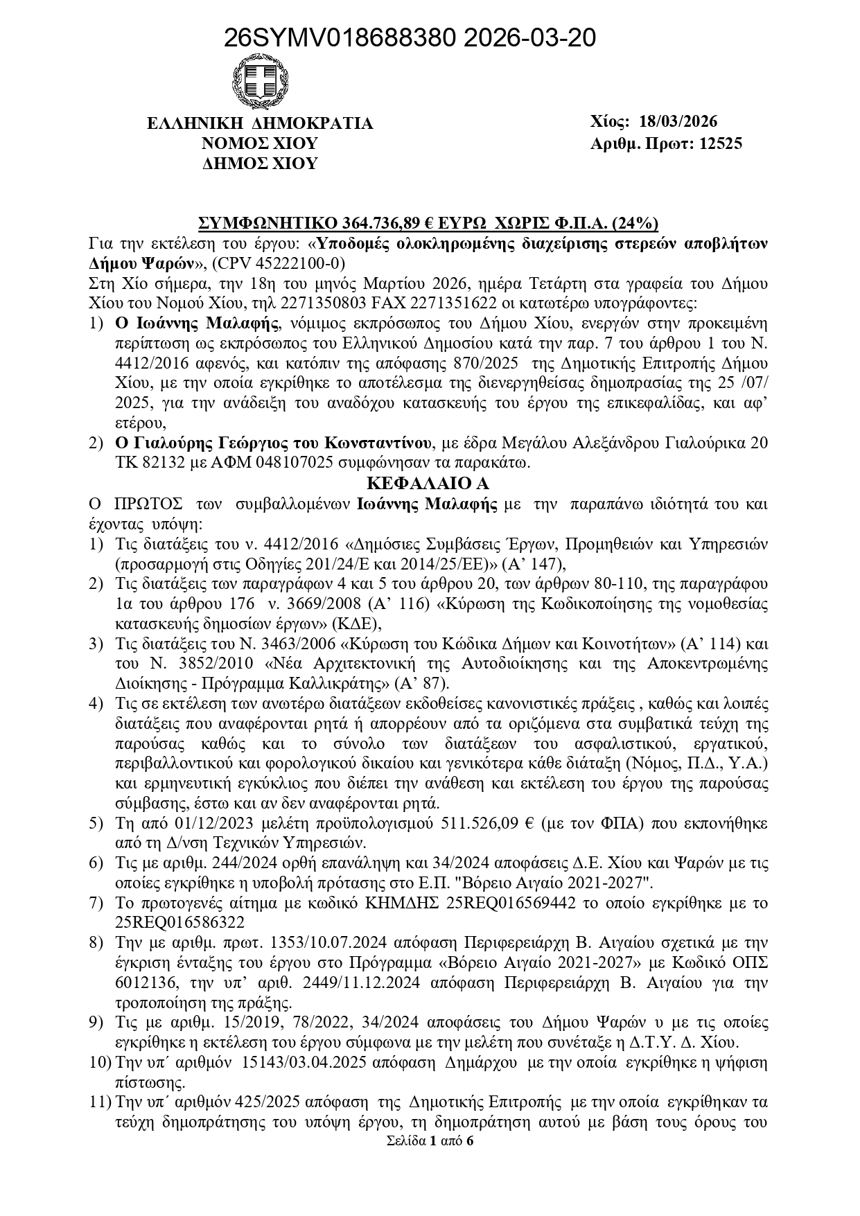 Ένα ακόμη σημαντικό έργο που ενισχύει την περιβαλλοντική προστασία και αναβαθμίζει ουσιαστικά τις υποδομές του Δήμου Ηρωικής Νήσου Ψαρών παίρνει τον δρόμο της υλοποίησης. Υπογράφηκε το Συμφωνητικό για την εκτέλεση του 1ου υποέργου με τίτλο «Υποδομές Ολοκληρωμένης Διαχείρισης Στερεών Αποβλήτων Δήμου Ψαρών», συνολικού συμβατικού προϋπολογισμού 452.273,74 ευρώ.