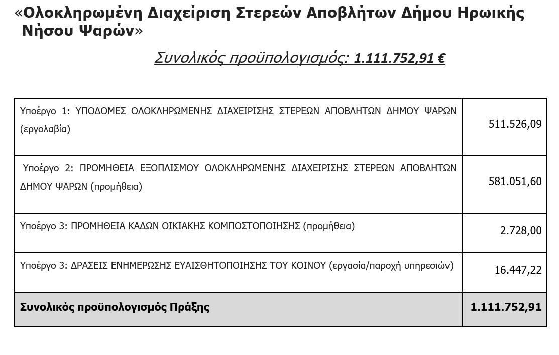 • για τη μετάβαση σε ένα σύγχρονο και βιώσιμο μοντέλο διαχείρισης αποβλήτων, με στρατηγικό στόχο τα Ψαρά να εξελιχθούν σε νησί μηδενικών αποβλήτων