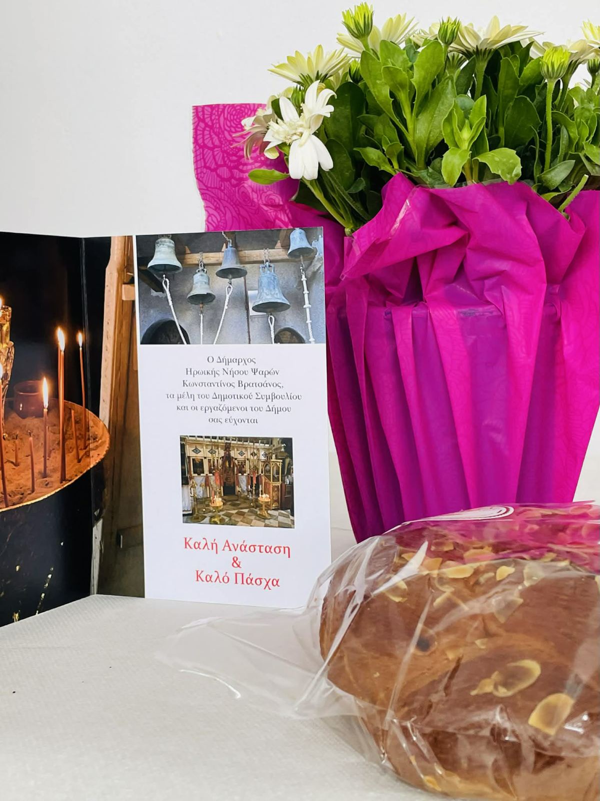 Ένα πασχαλινό τσουρέκι με κόκκινο αυγό, εορταστική σύνθεση με λουλούδια και την ευχετήρια κάρτα του Δήμου έλαβαν με αφορμή τις Άγιες Ημέρες του Πάσχα οι ηλικιωμένοι κάτοικοι του νησιού και οι τοπικοί φορείς, ως μια συμβολική, αλλά ουσιαστική πράξη αγά