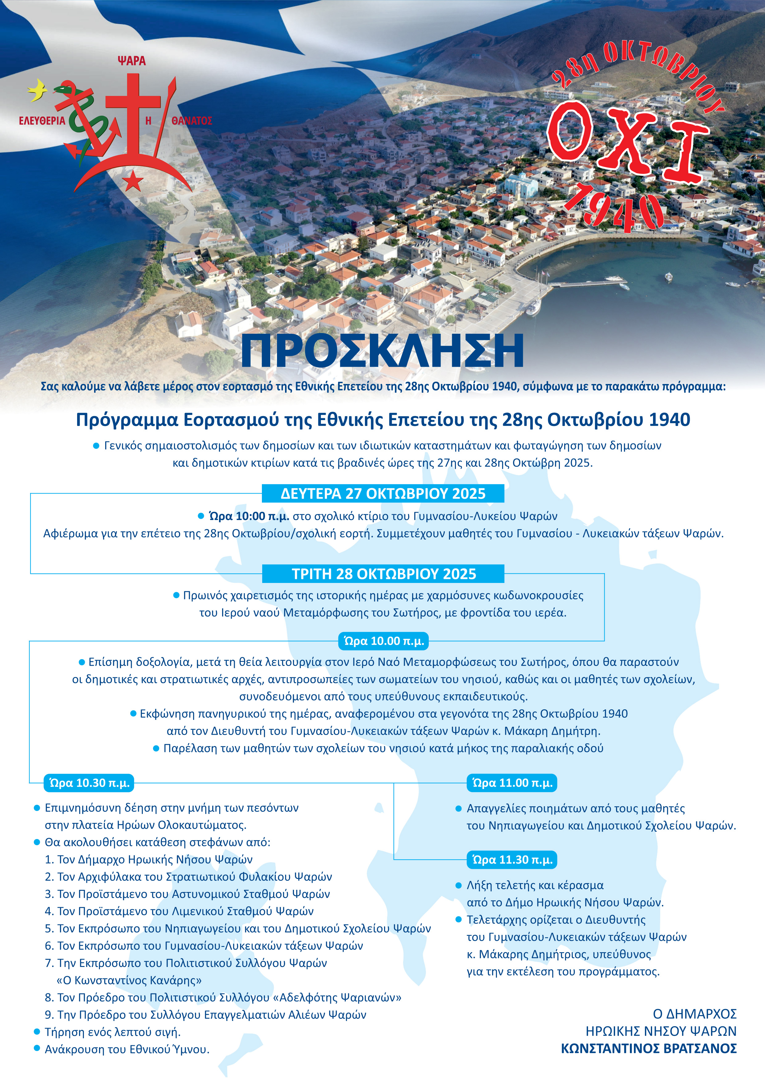 ΠΡΟΣΚΛΗΣΗ Πρόγραμμα Εορτασμού της 113ης Επετείου για την Απελευθέρωση των Ψαρών από τον Τουρκικό Ζυγό στις 21 Οκτωβρίου 1912 Σας καλούμε να λάβετε μέρος στις εκδηλώσεις που διοργανώνονται από το Δήμο Ηρωικής Νήσου Ψαρών για τον εορτασμό της επετε
