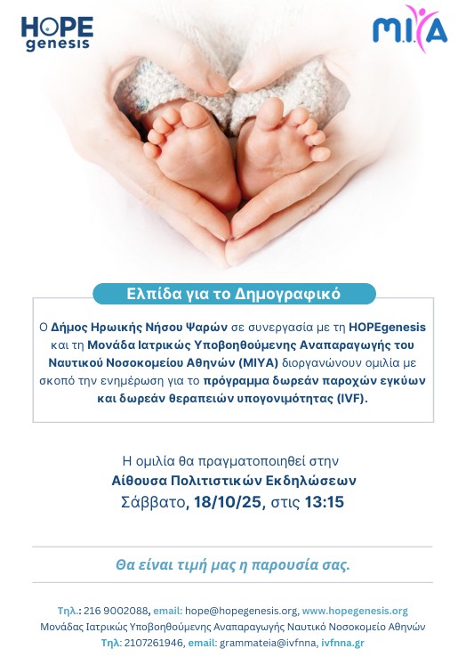 Ελπίδα για το Δημογραφικό Σάββατο 18 Οκτωβρίου στις 13:15 Αίθουσα Πολιτιστικών Εκδηλώσεων Ο Δήµος Ηρωικής Νήσου Ψαρών σε συνεργασία µε τη HOPEgenesis και τη Μονάδα Ιατρικώς Υποβοηθούµενης Αναπαραγωγής του Ναυτικού Νοσοκοµείου Αθηνών (ΜΙΥΑ)